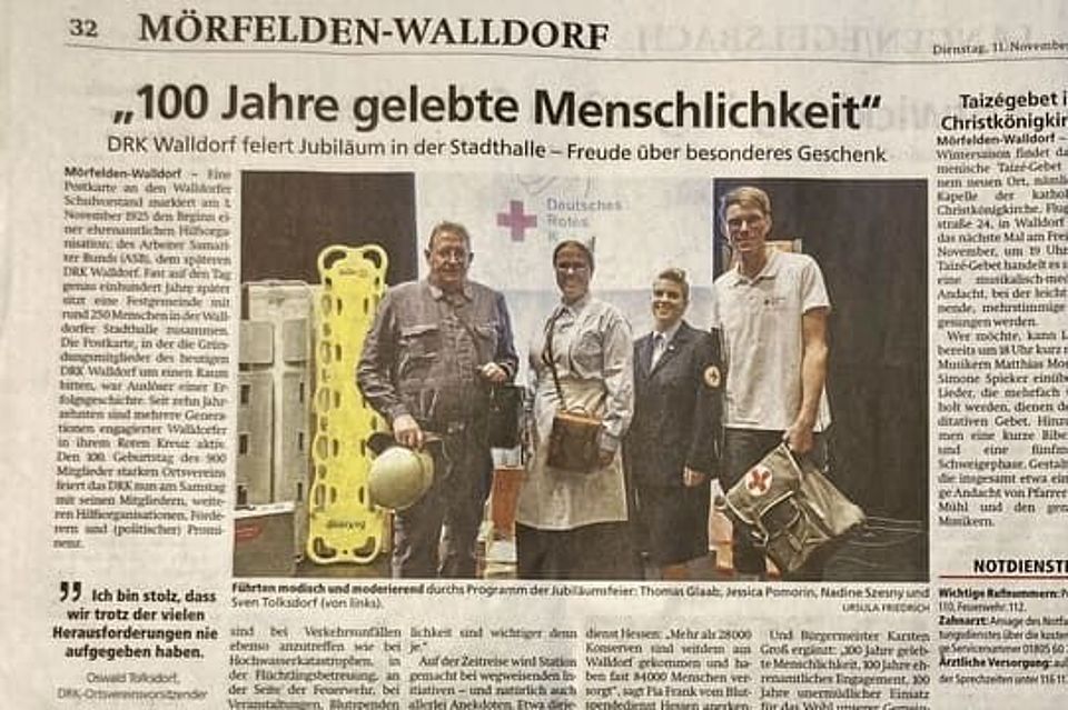 Mörfelden-Walldorf - Eine Postkarte an den Walldorfer Schulvorstand marldert am 1 November 1925 den Begimi ei-ner ehrenamtlichen Hilfsorga-nisation: des Arbeiter Samari-ter Bunds (ASB), dem späteren DRK Walldorf. Fast auf den Tag genau einhundert Jahre später sitzt eine Festgemeinde mit rund 250 Menschen in der Wall-dorfer Stadthalle zusammen. Die Postkarte, in der die Grün-dungsmitglieder des heutigen DRK Walldorf um einen Raum bitten, war Auslöser einer Er-folgsgeschichte. Seit zehn Jahr-zehnten sind mehrere Genera-tionen engagierter Walldorfer in ihrem Roten Kreuz aktiv. Den 100. Geburtstag des 900 Mitglieder starken Ortsvereins feiert das DRK nun am Samstag mit seinen Mitgliedern, weite-ren Hilfsorganisationen, Förde-rern und (politischer) Promi-nenz.