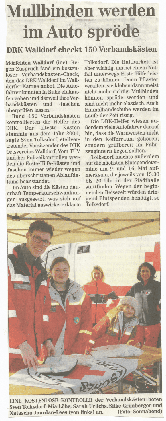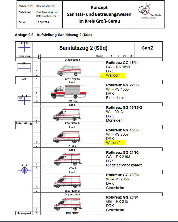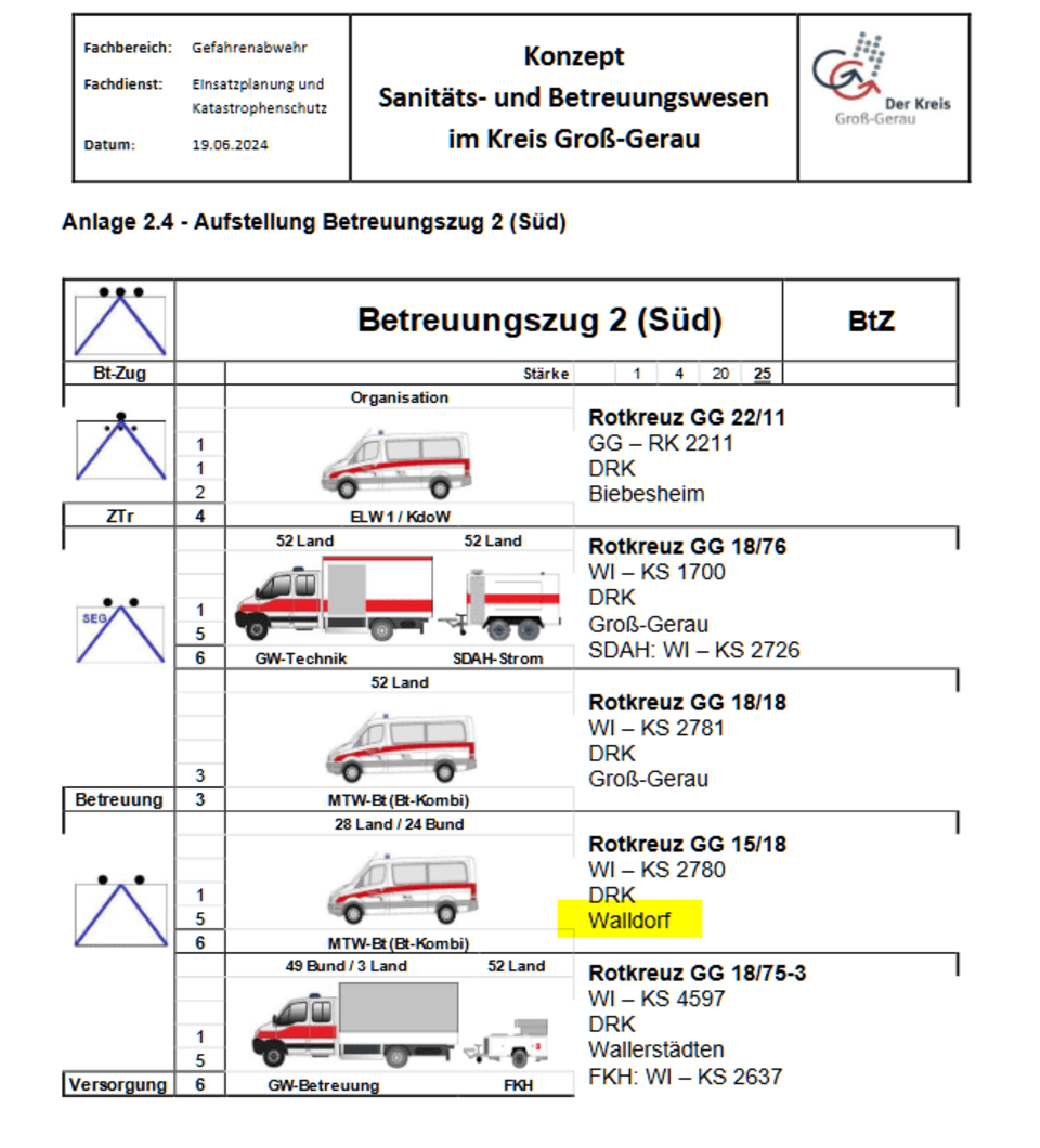 Über viele Jahre, unter anderem unter Leitung von Lukas Distler und Andrea Kuschmierz, stellte das DRK Walldorf gemeinsam mit dem DRK Mörfelden den „Sanitätszug 4 des Kreises Groß-Gerau“. Mit der Neukonzipierung der Sanitätszüge 2015 bilden wir nun mit insgesamt 5 Ortsvereinen den „Sanitätszug Süd" und stellen so eine Einheit mit 50 Einsatzkräften.