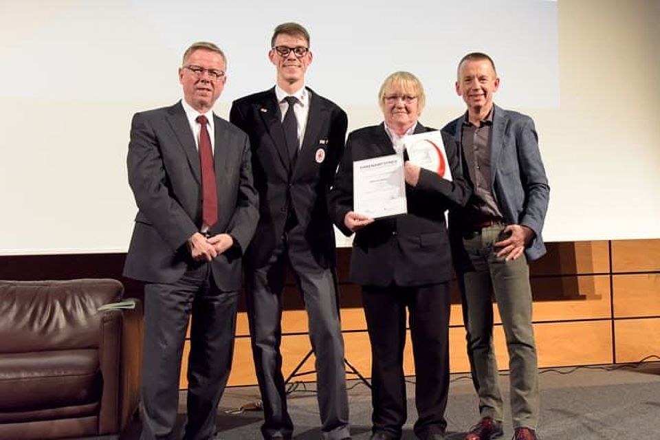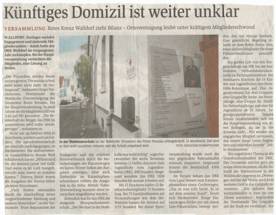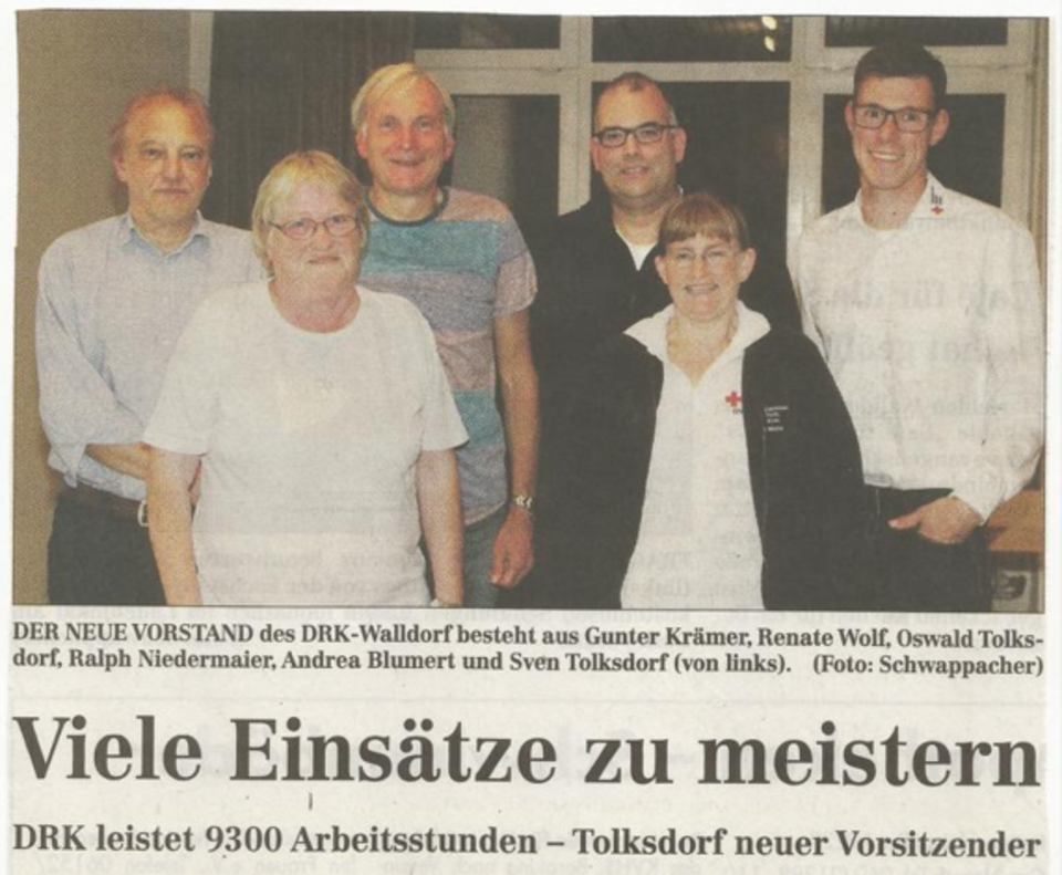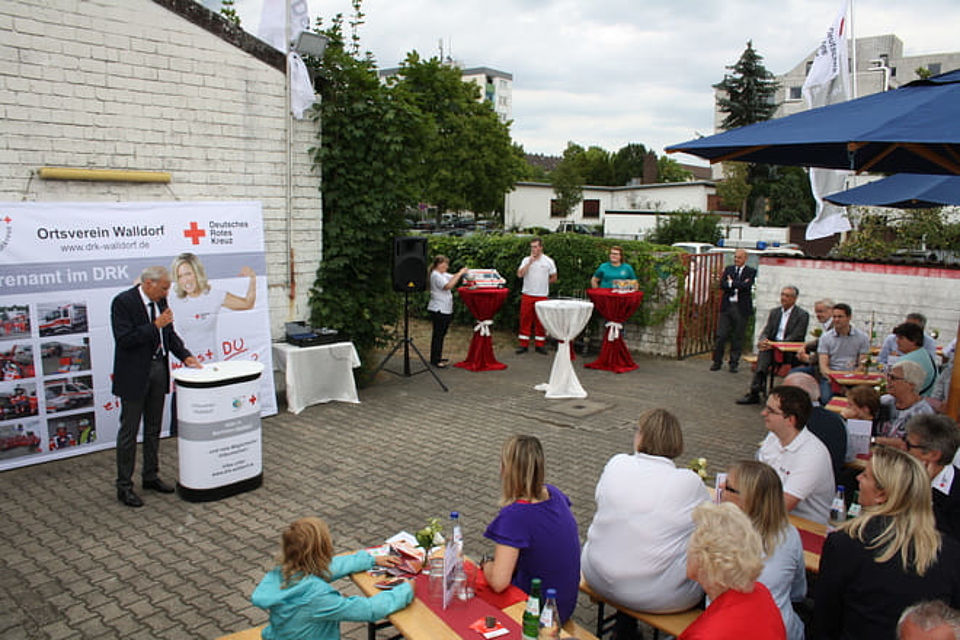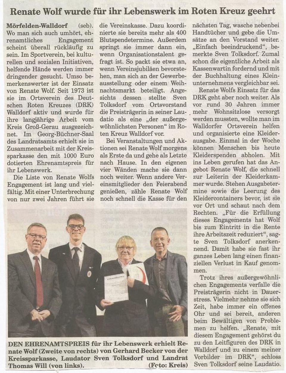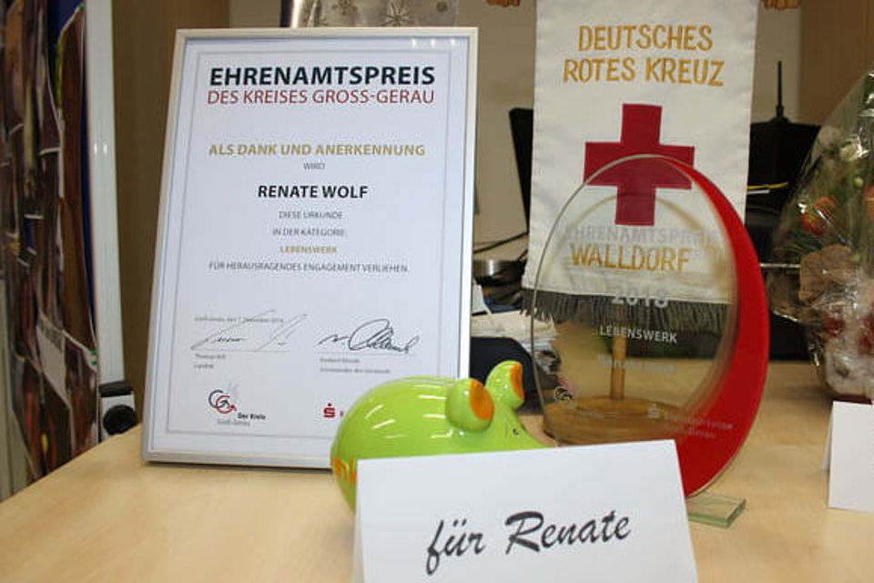 Der Landkreis ehrte Renate Wolf für ihr Lebenswerk. Seit 1973 engagiert sie sich ehrenamtlich im DRK. In der Laudatio nannte Sven Tolksdorf sie „eine Leitfigur des DRK in Walldorf”.