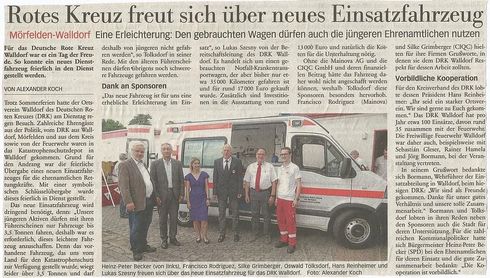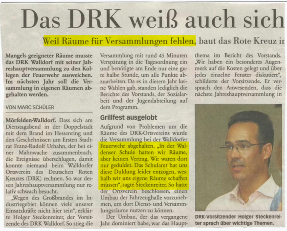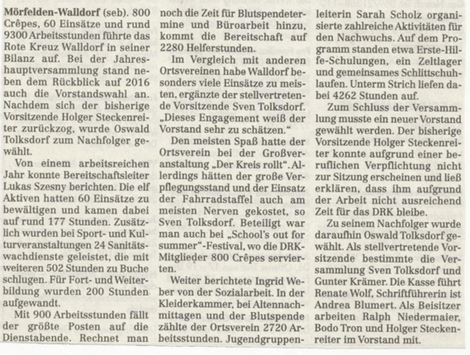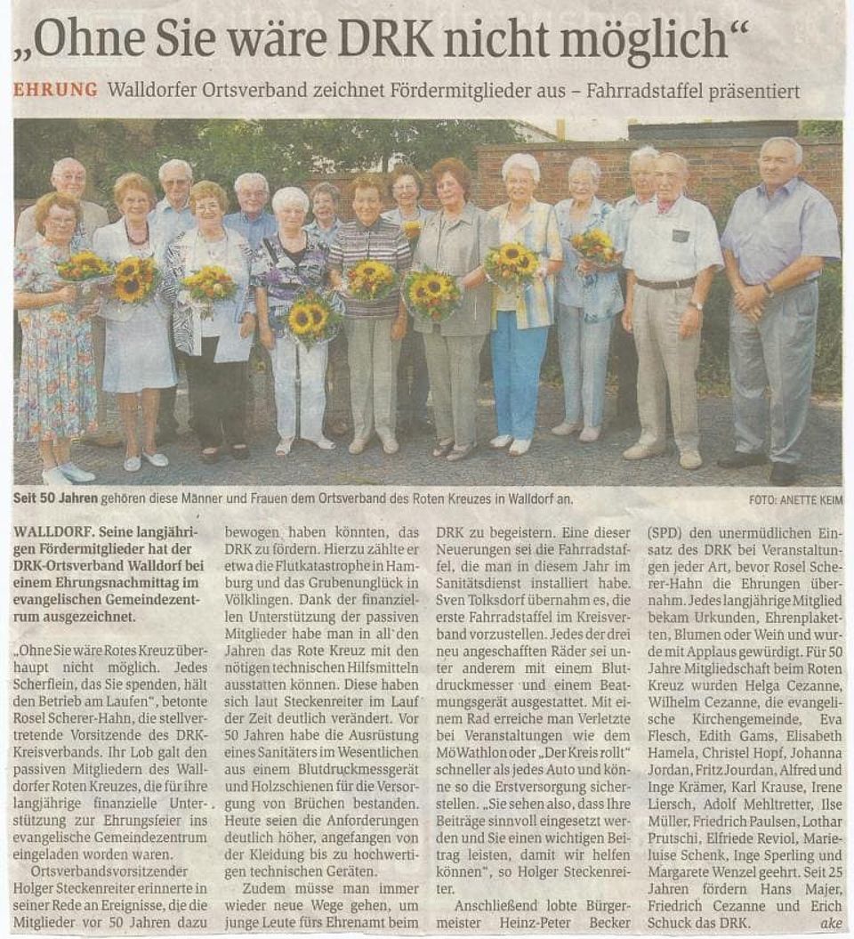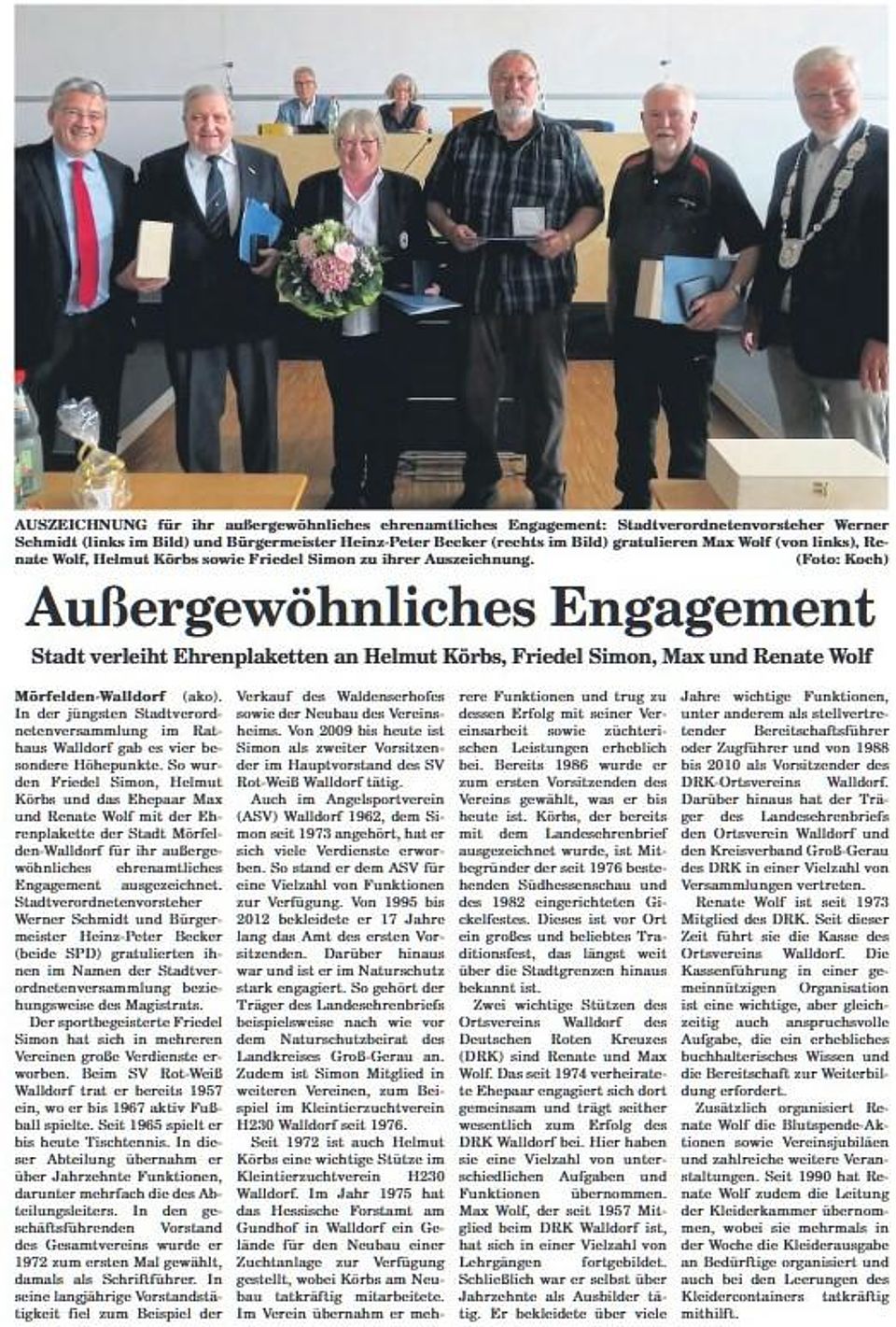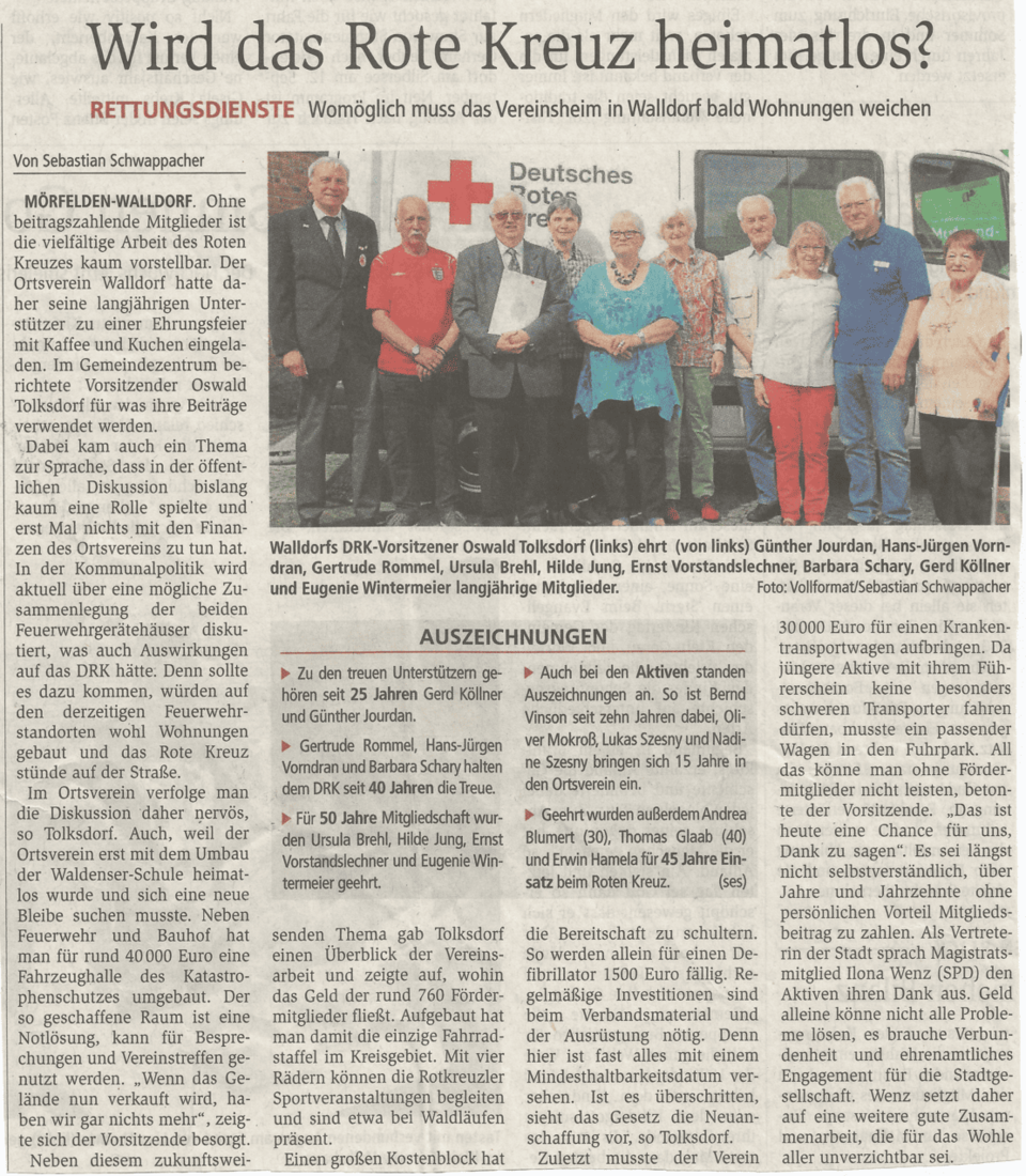 Der Landkreis ehrte Renate Wolf für ihr Lebenswerk. Seit 1973 engagiert sie sich ehrenamtlich im DRK. In der Laudatio nannte Sven Tolksdorf sie „eine Leitfigur des DRK in Walldorf”.