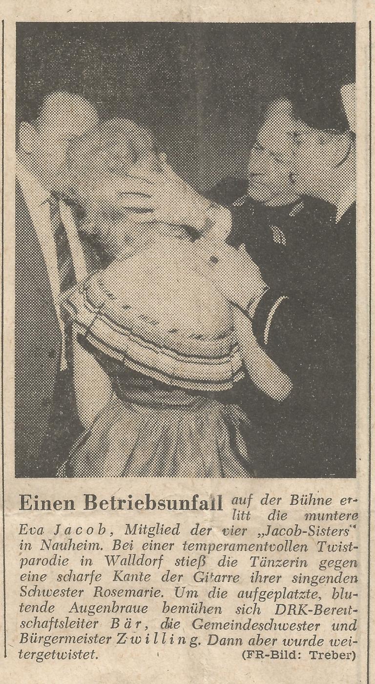 Auch sowas passiert. Beim Auftritt der Jacob Sisters musste Eva Jacob wegen einem Zusammenstoß beim Twisten behandelt werden.