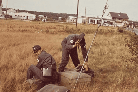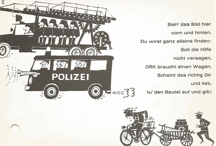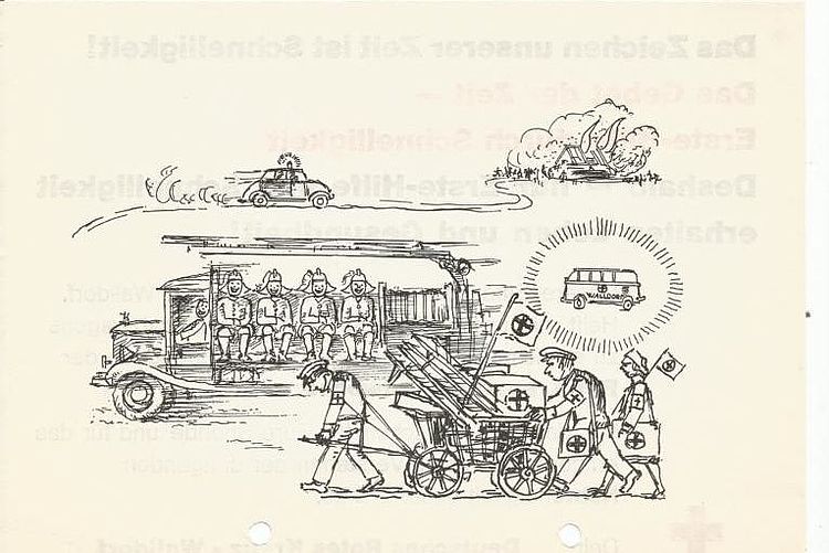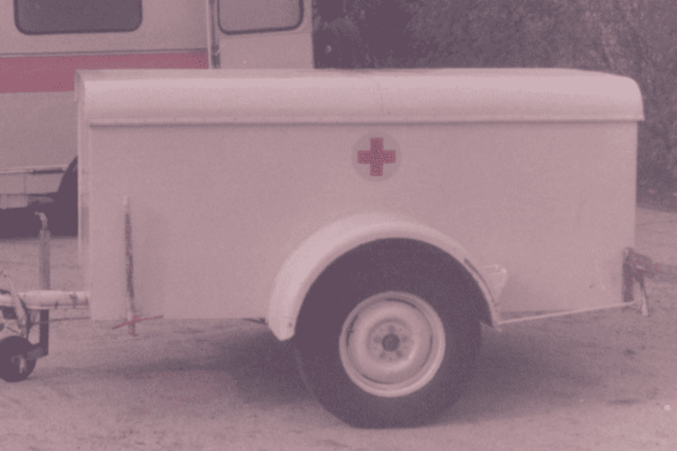 Bis 1962 mussten unsere Sanitäter bei Einsätzen zu Fuß mit dem Leiterwagen zum Unfallort eilen. Wurde gleichzeitig die Feuerwehr gerufen, konnte wenigstens eine oder einer unserer Helfenden pro Feuerwehrfahrzeug mitfahren.