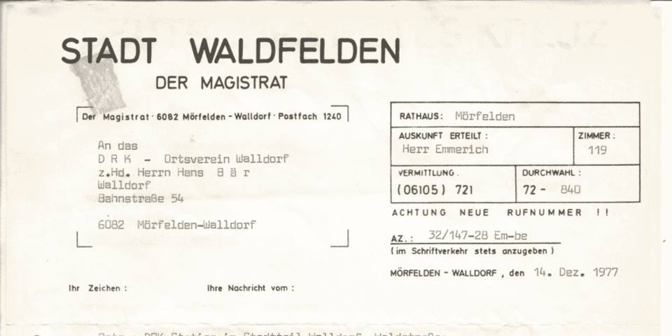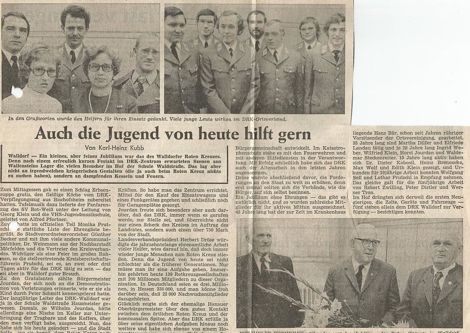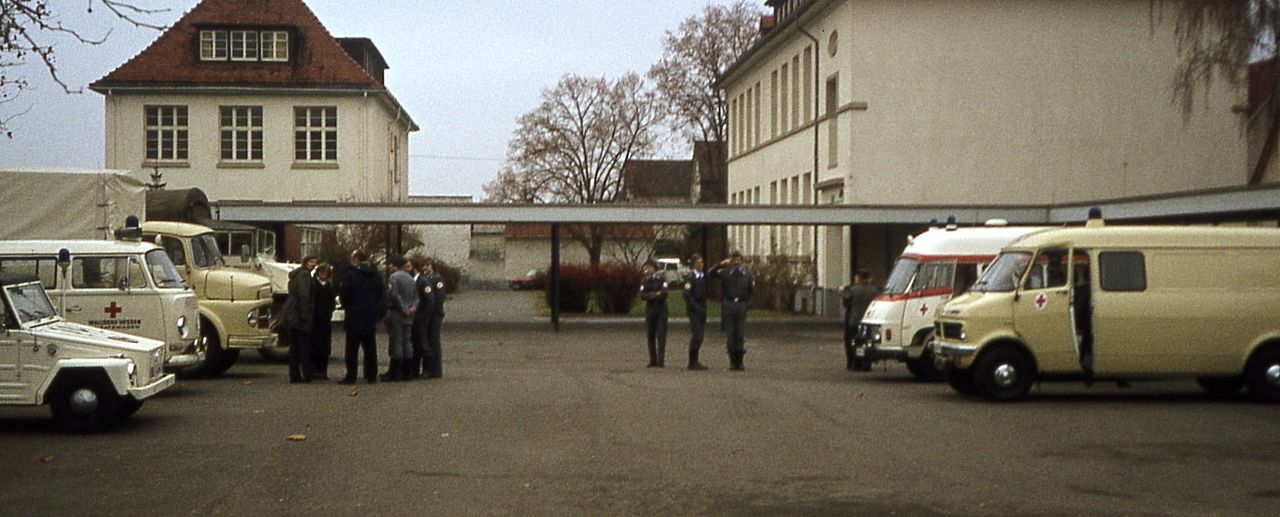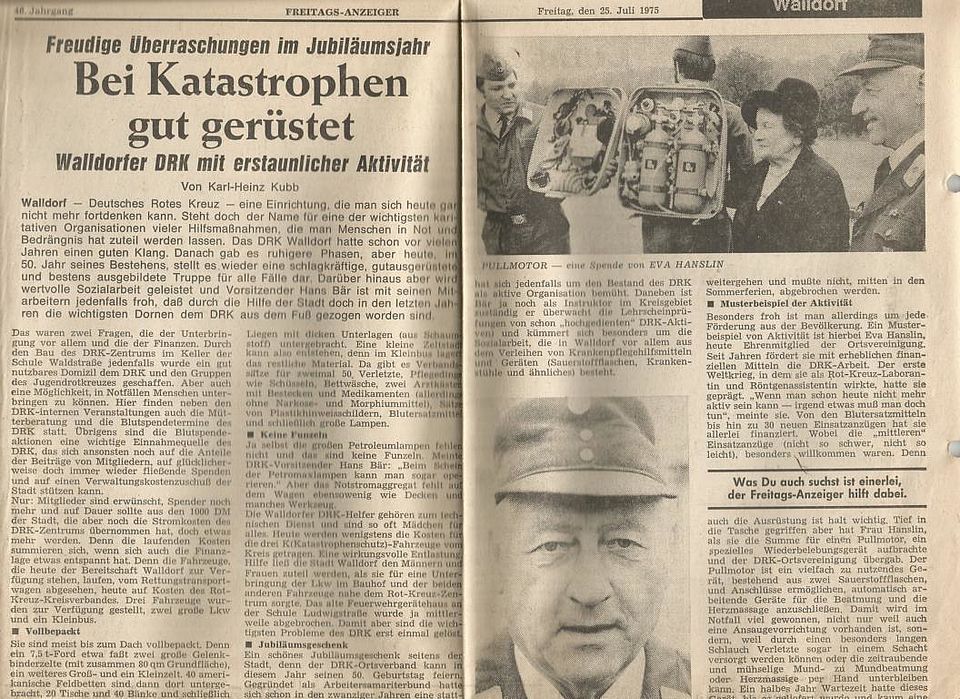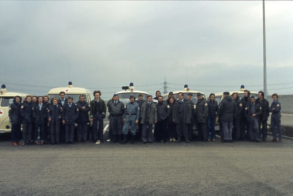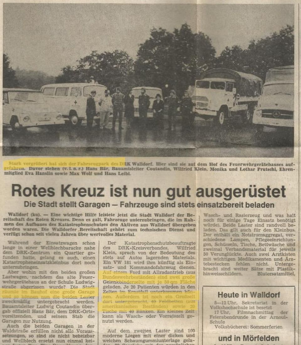Jubiläen sind Gelegenheiten um zurück, aber auch nach vorn zu blicken. Zehn Jahre zuvor war man froh über den einzigen Einsatzwagen, der zur Verfügung stand. Mitte der 1970er ist der Fuhrpark gewaltig angewachsen. Ergänzend zu eigenen Fahrzeugen wurden nun auch Fahrzeuge des DRK-Kreisverbandes und des Katastrophenschutzes in Walldorf stationiert. Die Fahrzeuge wurden von uns in den Einsatz gebracht und auch gewartet. Bis heute sind unterschiedliche Fahrzeuge des Katastrophenschutzes in Walldorf stationiert.
