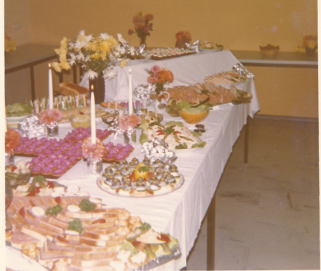 Das selbstbereitete Buffet zur Einweihungsfeier. Man beachte das Rote Kreuz aus Salamischnittchen.