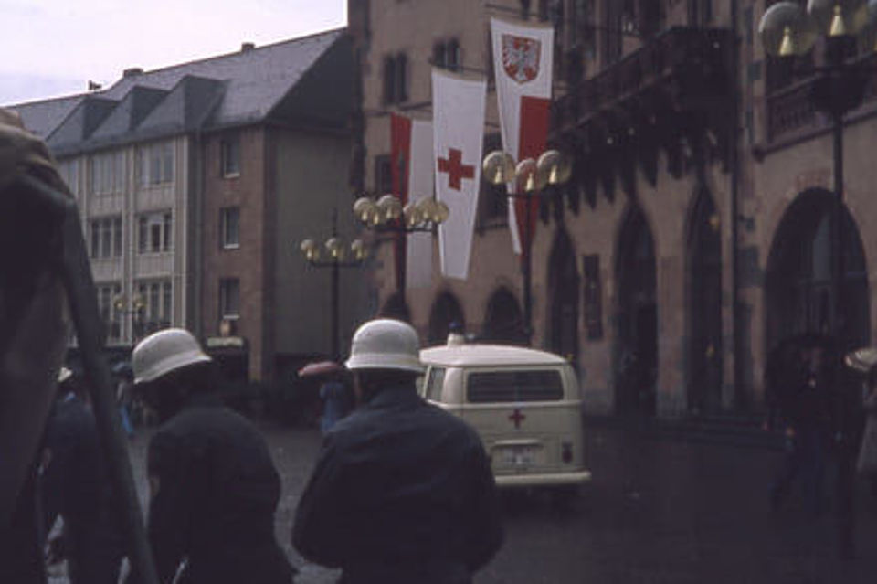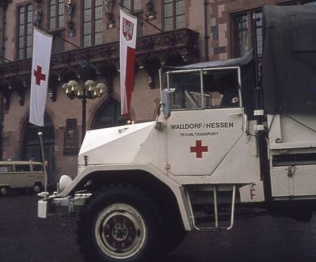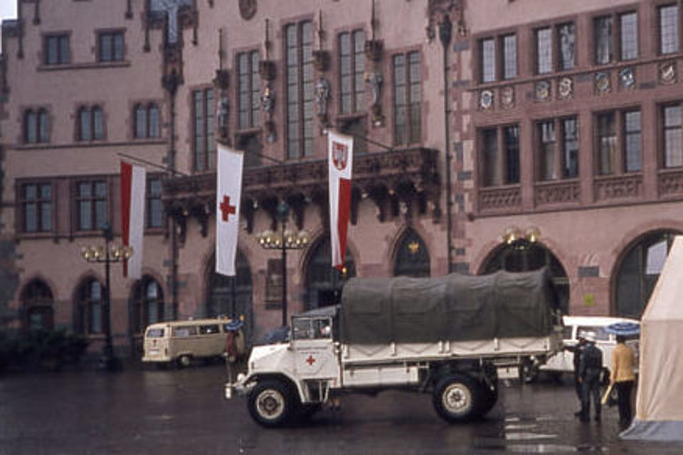 Unser Ford G398, auch als Nato-Ziege bekannt, welcher aus Beständen der Bundeswehr stammte, steht hier vor dem Frankfurter Römer. Unser Verein hatte für die dortigen Feierlichkeiten unser großes Zelt und die Arbeitskräfte zur Verfügung gestellt.